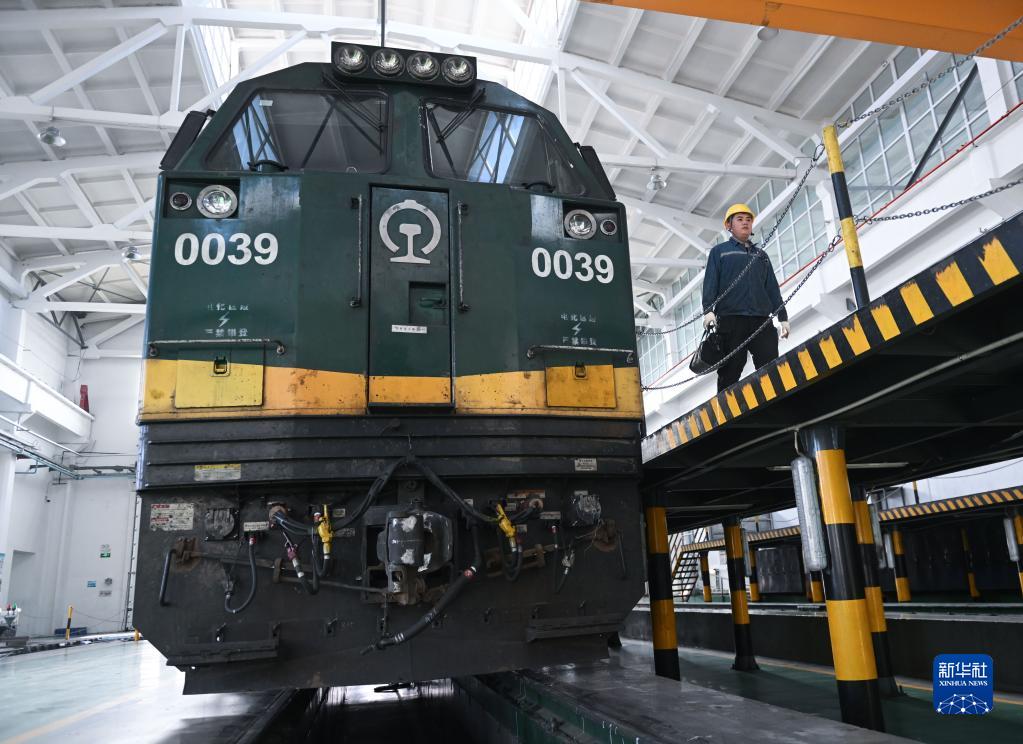 2月4日,在格尔木机务段检修车间,马国仁在巡检机车。