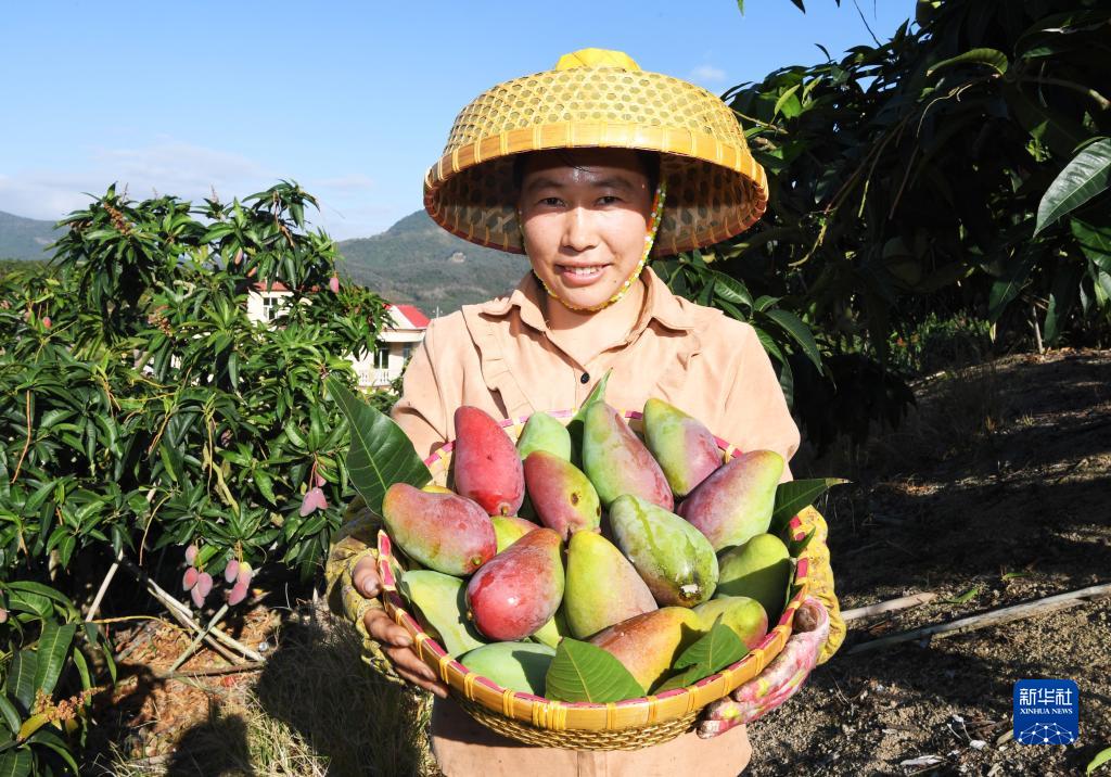 海南省三亚市育才生态区芒果园的工人杨秀英展示采摘的芒果(2月1日摄)。
