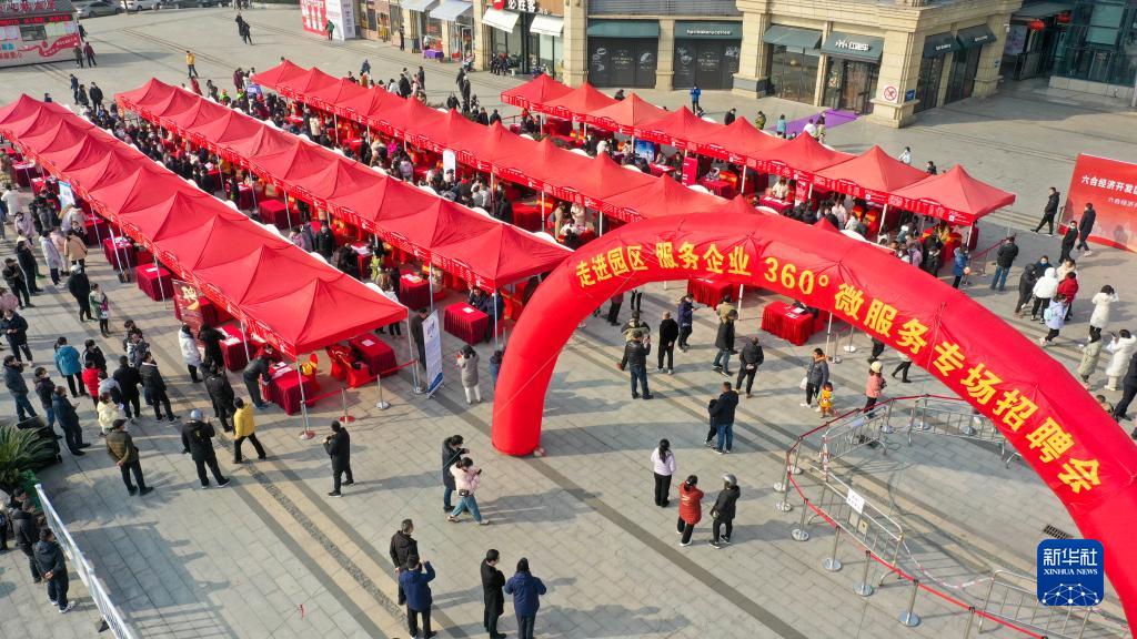 2月4日,求职者在江苏省南京市六合区经济开发区举办的“走进园区 服务企业 360°微服务”专场招聘会上了解招聘信息(无人机照片)。