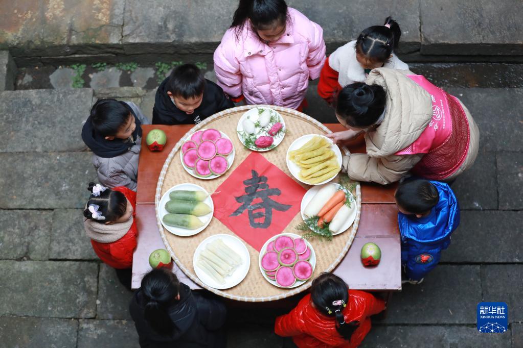 2月4日,在浙江省杭州市临安区天目山镇交口村文化礼堂,小朋友在学习立春“咬春”民俗知识。