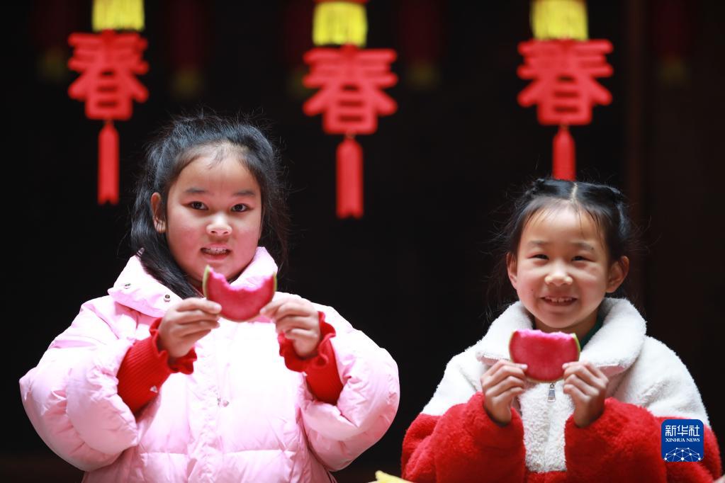 2月4日,在浙江省杭州市临安区天目山镇交口村文化礼堂,小朋友吃萝卜“咬春”。