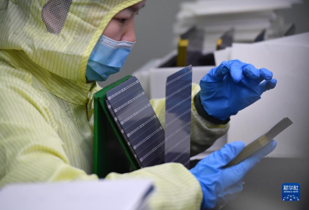 2月2日,检验人员在隆基绿能高陵电池工厂检查电池片。