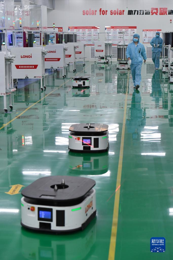 2月2日在隆基绿能高陵电池工厂内拍摄的智能搬运机器人。