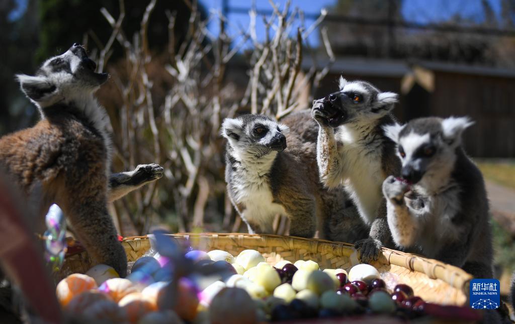 2月4日,云南野生动物园的狐猴品尝“元宵美食”。