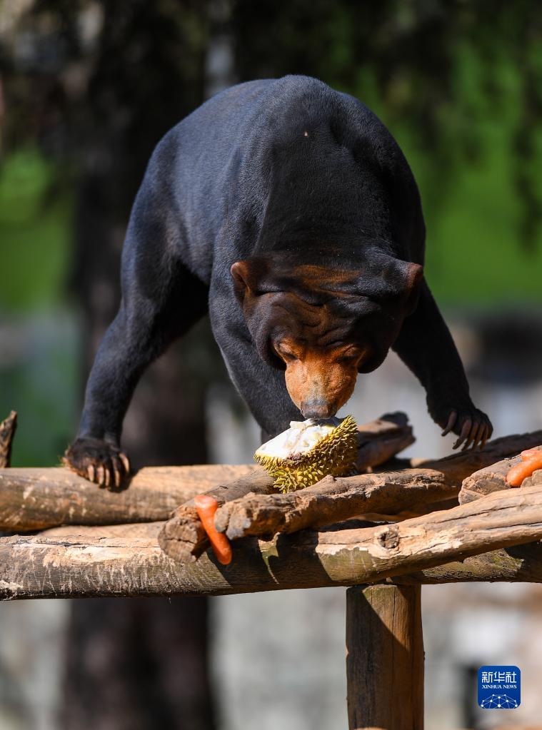 2月4日,云南野生动物园的马来熊品尝榴莲。