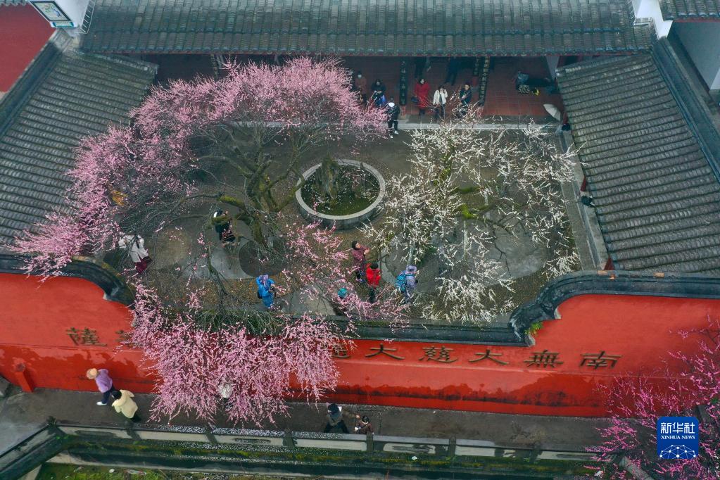 立春时节,位于福州北峰山区的千年古刹林阳寺梅花相继绽放,吸引众多游客前来游玩赏花。