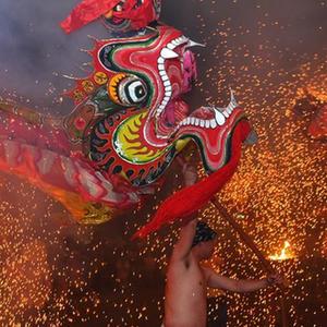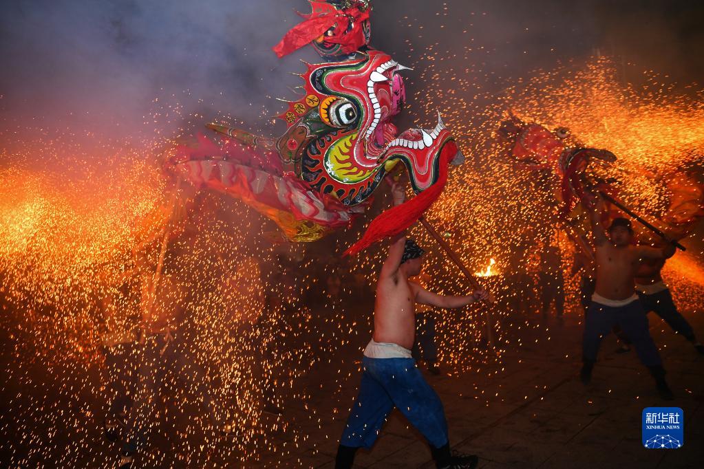 2月4日,在湖南省湘西土家族苗族自治州保靖县宏一蓝泊湾广场,民间艺人表演钢火烧龙。