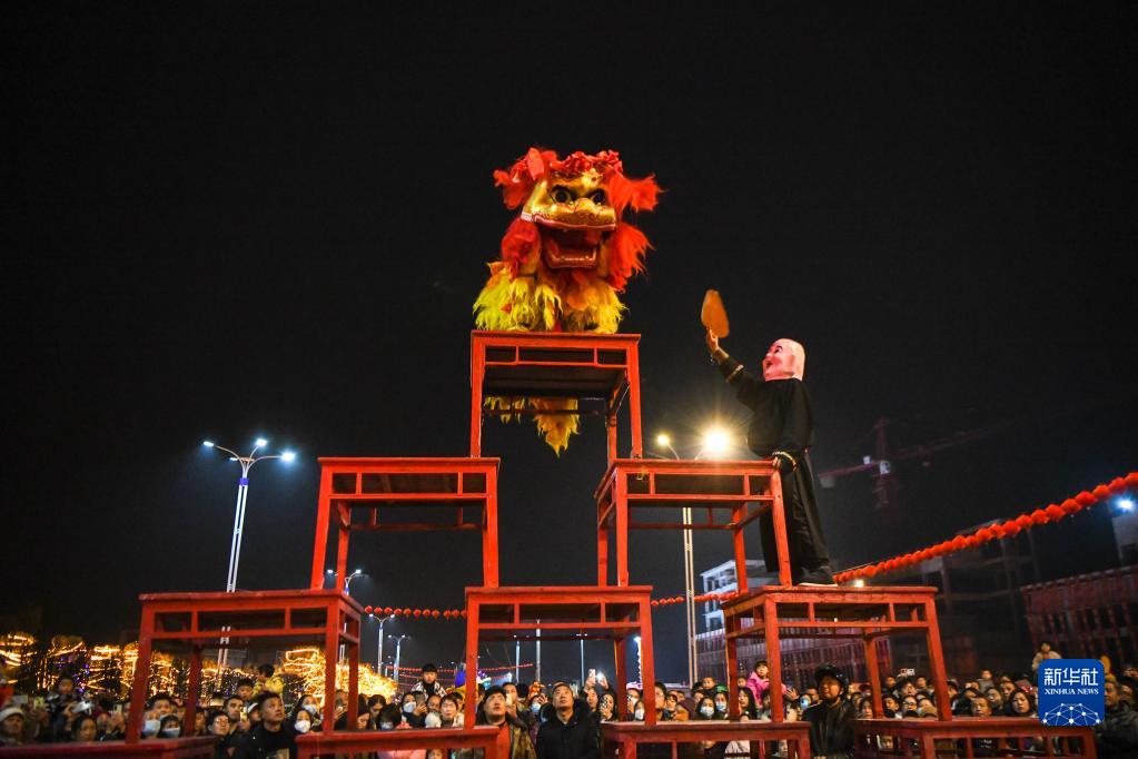 2月4日,在湖北省恩施土家族苗族自治州来凤县翔凤镇武汉大道,民间艺人在表演狮子灯。