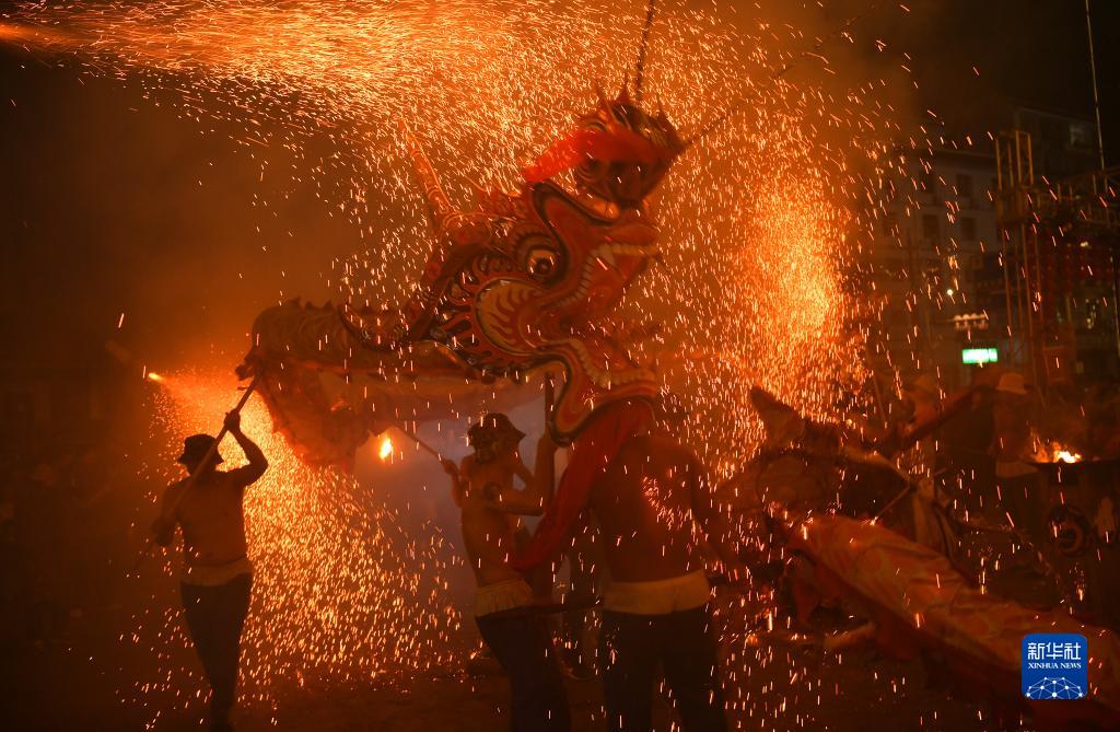 2月4日,在湖南省湘西土家族苗族自治州保靖县宏一蓝泊湾广场,民间艺人表演钢火烧龙。