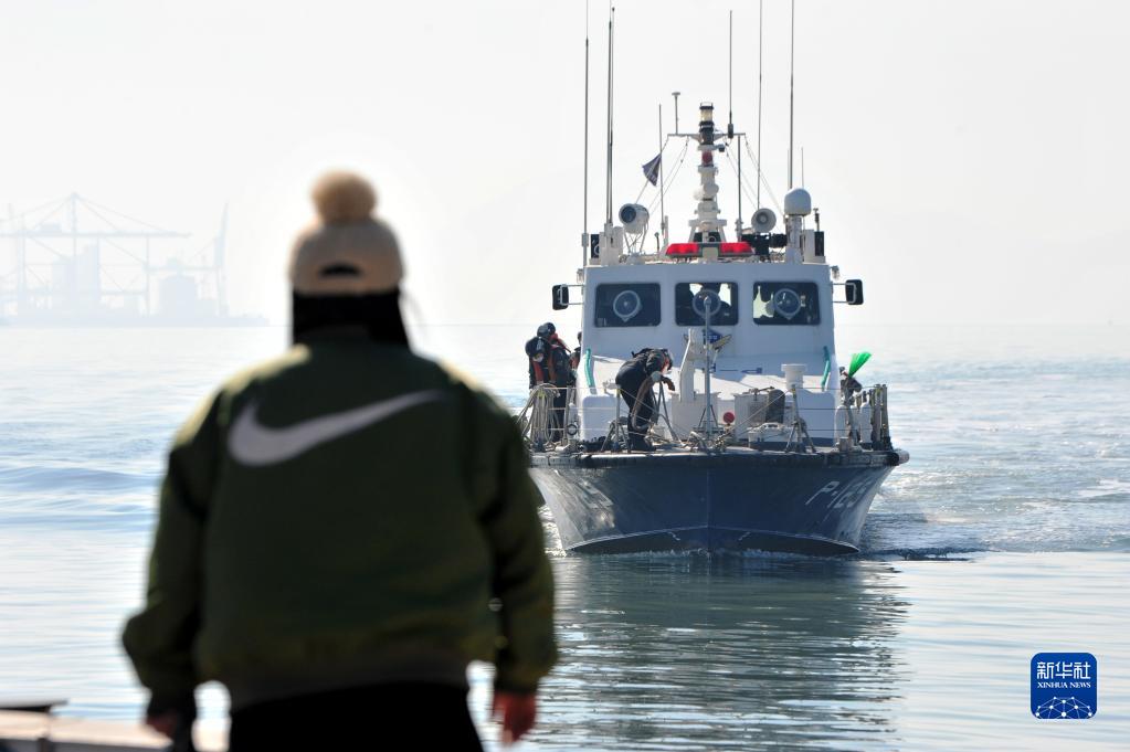 2月5日,载有获救船员的船只驶入韩国全罗南道木浦市的港口,一名获救船员的家属在码头等待。