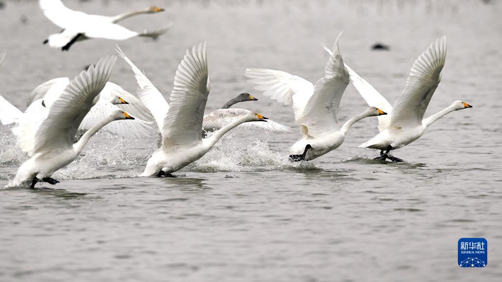 2月2日,黄河西岸的合阳黄河湿地自然保护区内,天鹅展翅飞翔。