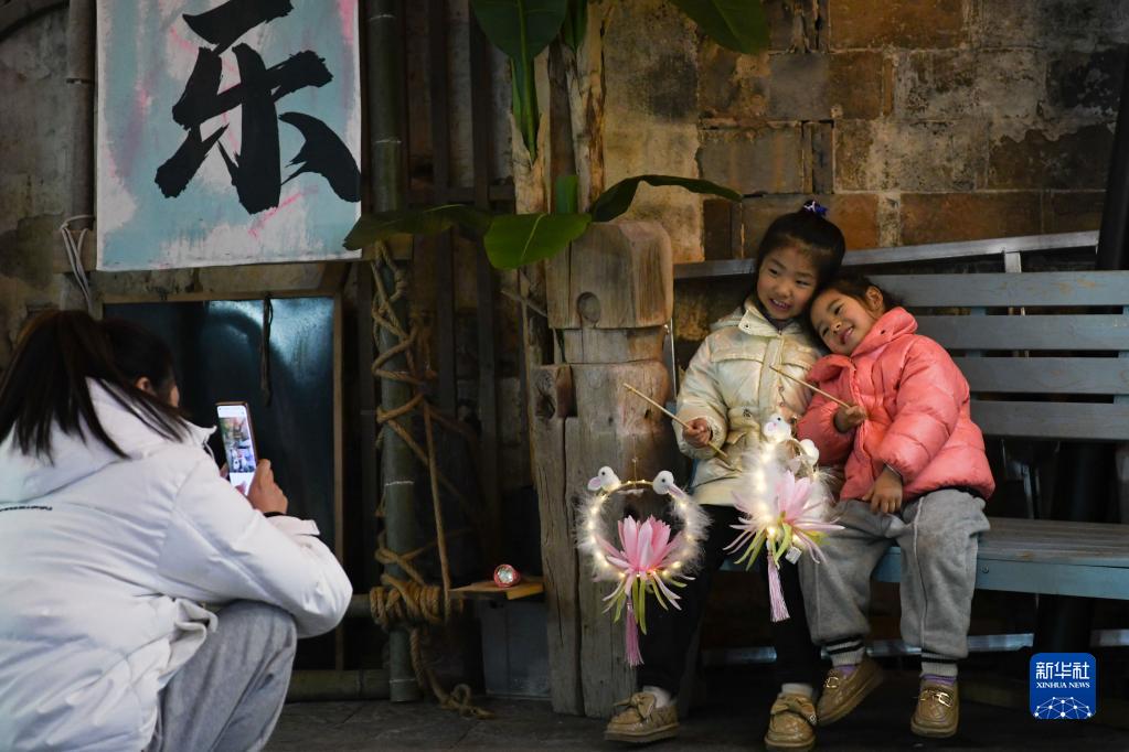 2月4日,家长在宏村给小朋友拍照。