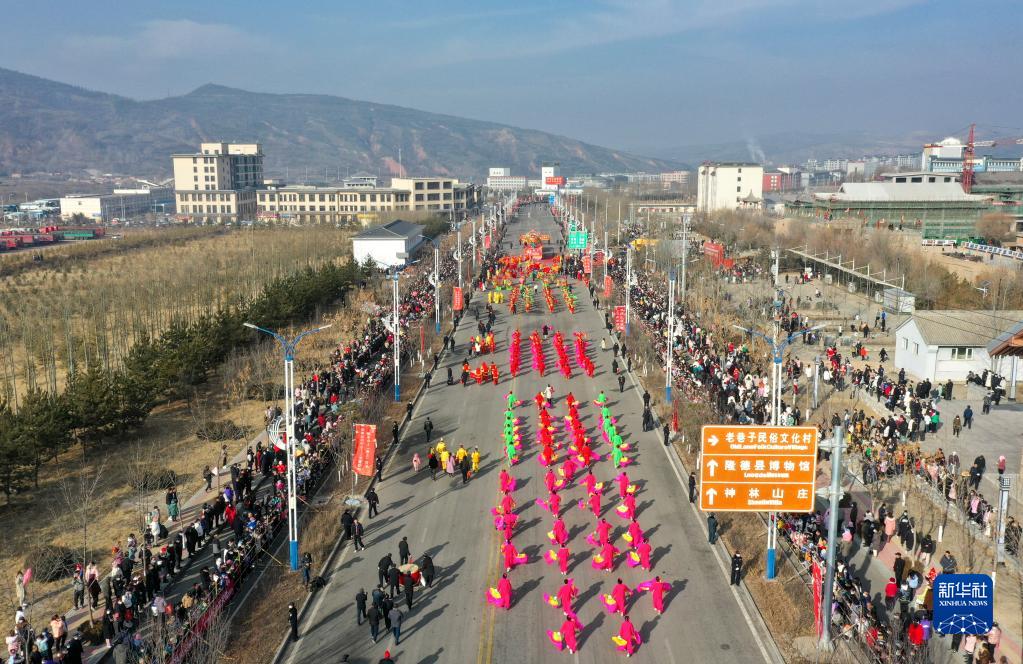 这是宁夏固原市隆德县举行的社火展演(2月5日摄,无人机照片)。