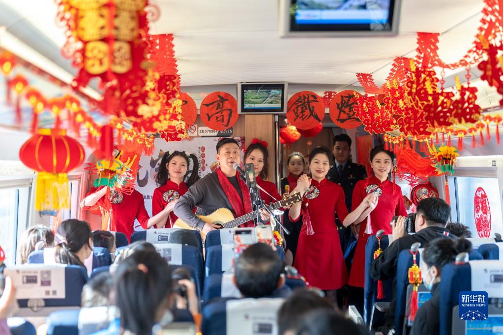 2月4日,沈阳客运段列车工作人员为旅客表演节目。