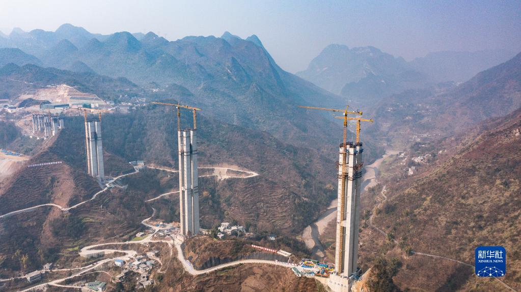 2月1日拍摄的纳晴高速六枝特大桥施工现场(无人机照片)。