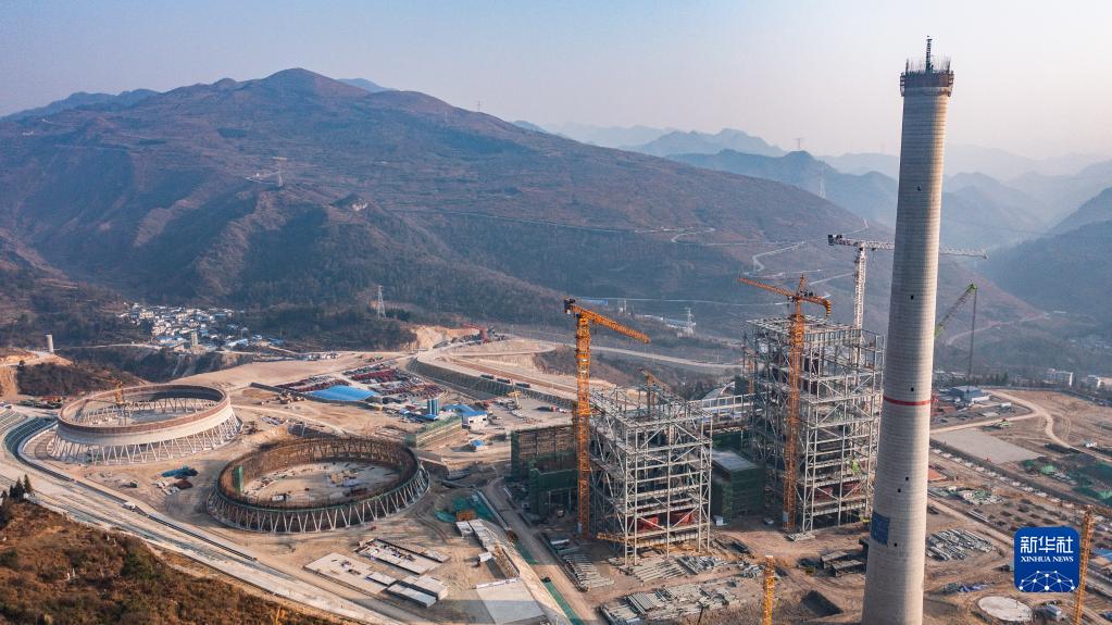 2月1日拍摄的盘江新光燃煤发电项目施工现场(无人机照片)。