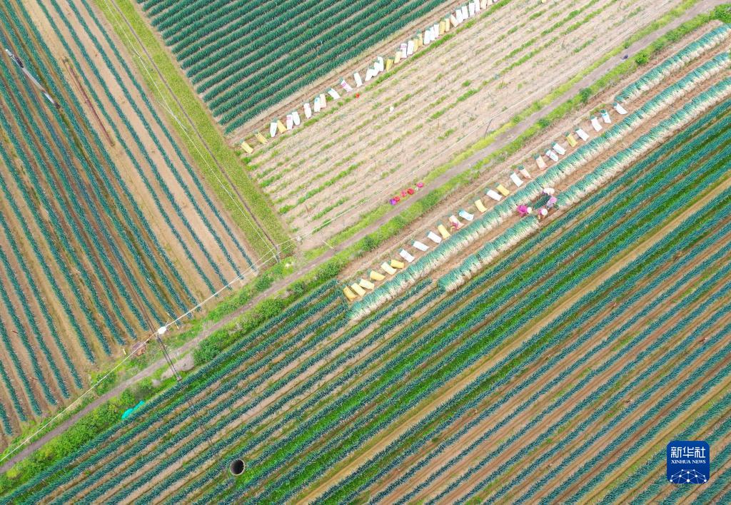 2月4日,村民在漳浦县六鳌镇的一处农田里采收大葱(无人机照片)。