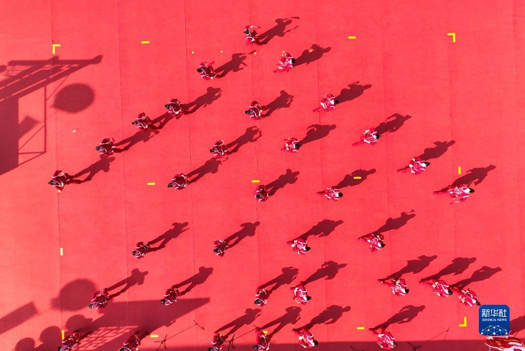 2月5日,演员在江苏省淮安市盱眙县进行腰鼓表演(无人机照片)。