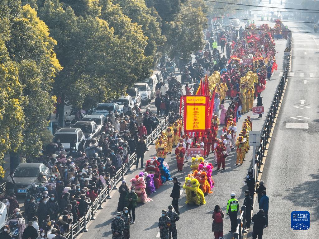 2月5日,民间艺人在江苏省淮安市盱眙县街头巡游(无人机照片)。