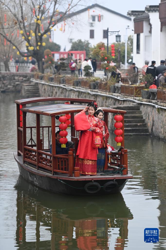 2月5日,游客在浙江省湖州市吴兴区八里店镇潞村乘船巡游。