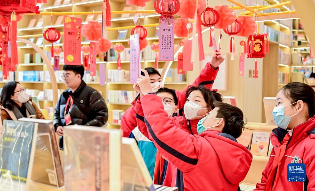2月5日,孩子们在上海市杨浦区新江湾城街道学悦风咏书社猜灯谜。