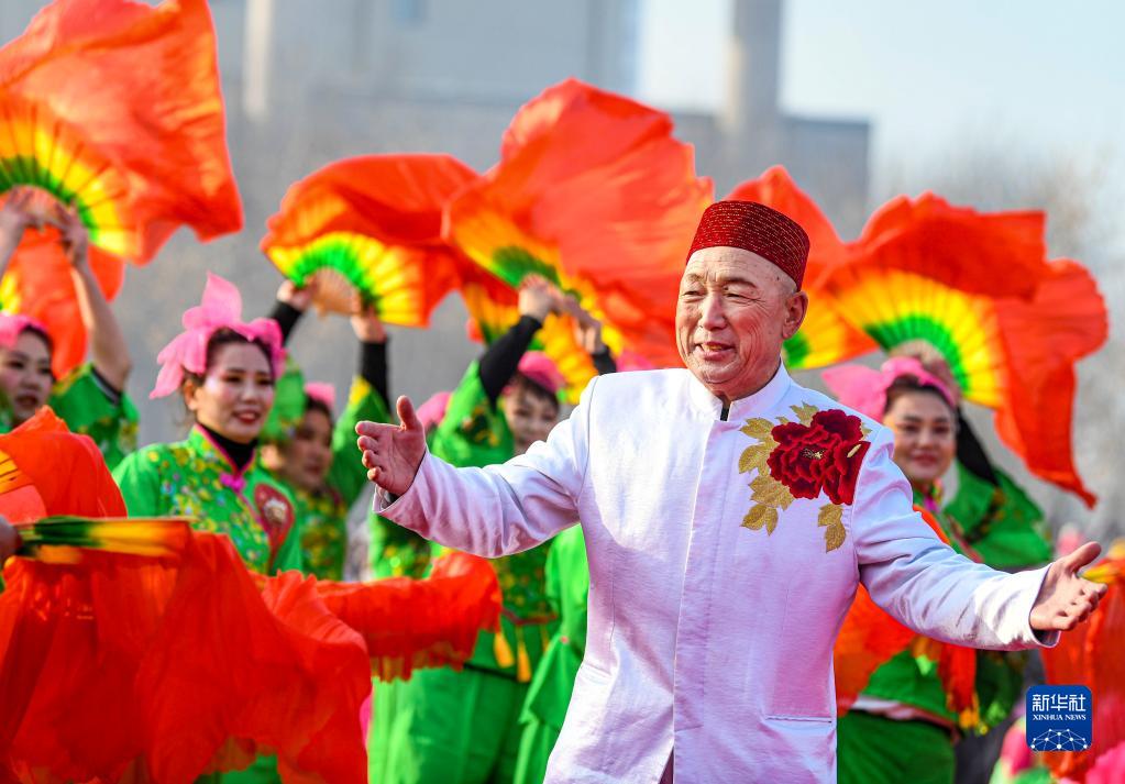 2月5日,在新疆乌鲁木齐市米东区人民广场,社火队员进行新疆“花儿”表演。