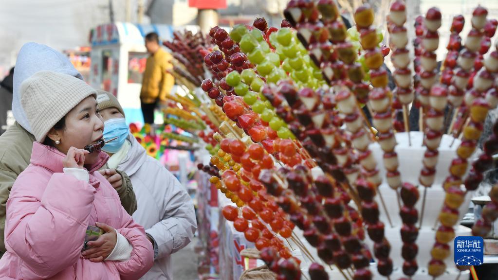 2月5日,游客在河北省任丘市吕公堡镇后李花村 “糖墩儿节”上品尝糖葫芦。
