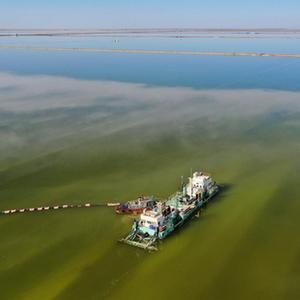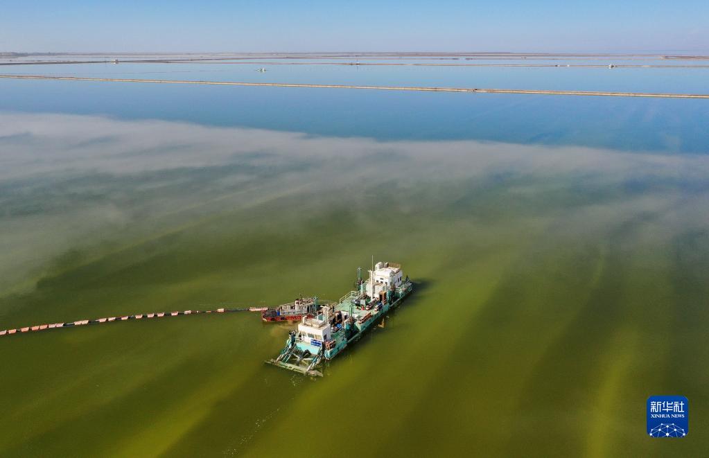 水采船在察尔汗盐湖中作业(2月2日摄,无人机照片)。