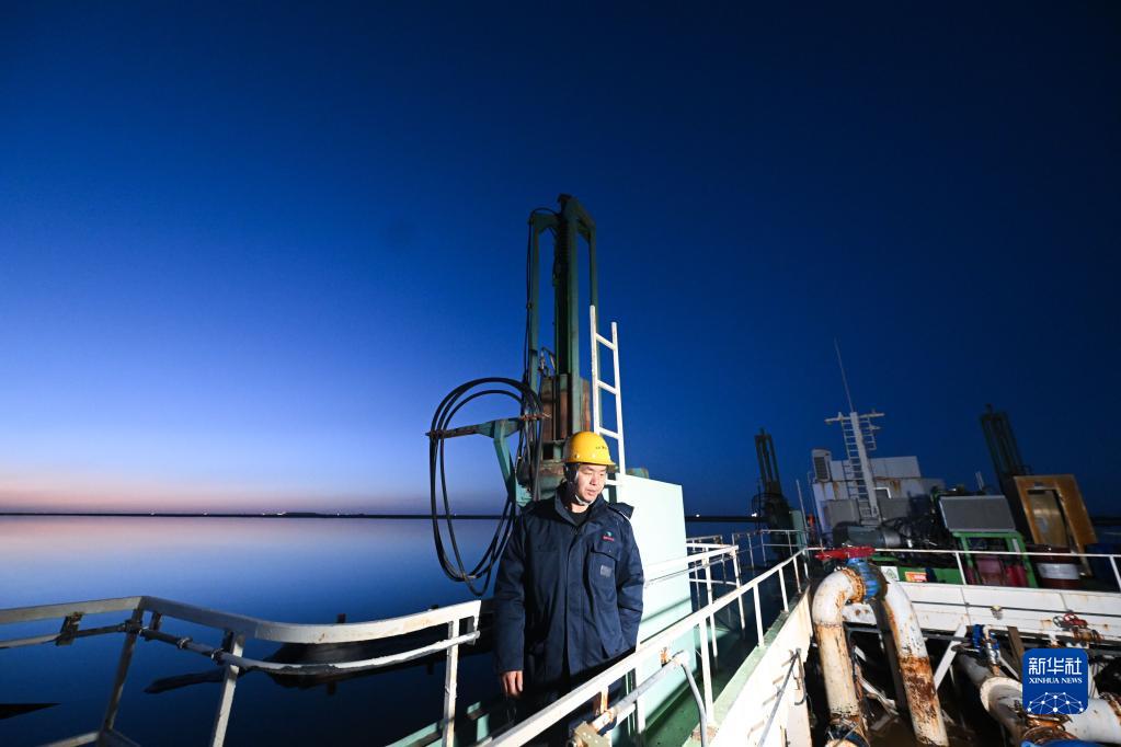 2月2日晚间,贺连福在水采船上巡检。