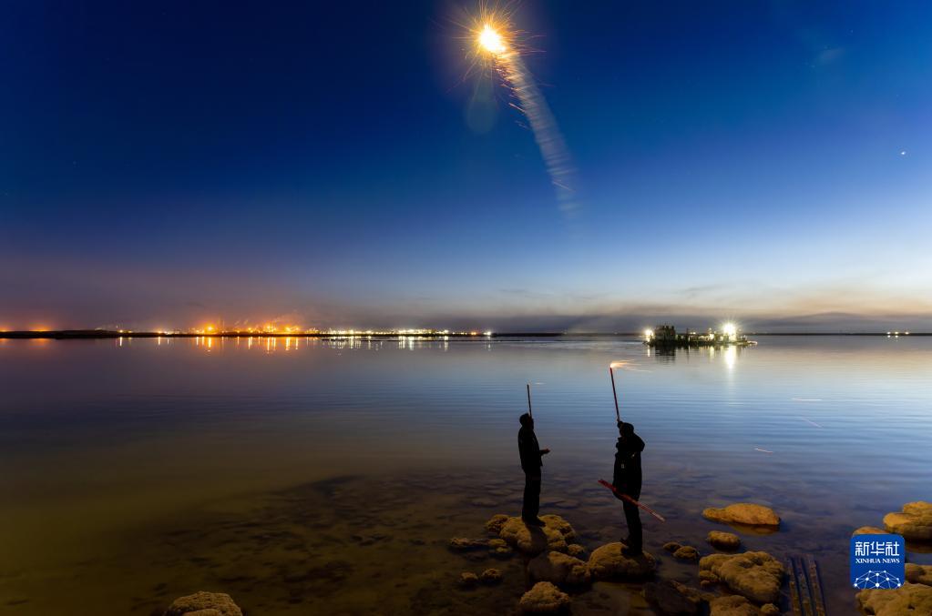 2月2日晚上,贺连福(右)与同事在盐田岸边燃放烟花,迎接即将到来的元宵佳节。