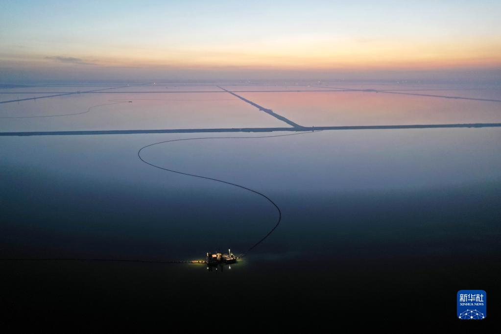 2月2日,在青海省海西蒙古族藏族自治州的察尔汗盐湖,一艘锚船在晨光中工作(无人机照片)。一名水采船船长通常负责管理两个采收小队,采收小队由一艘水采船、一艘工作船、一艘锚船组成。
