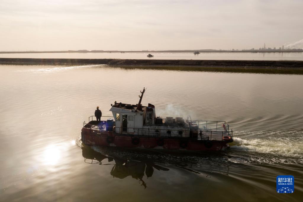 2月2日,贺连福乘坐工作船前往水采船。水采船在剧毒的卤水盐田中作业,工作人员每天上下水采船都要通过工作船接驳。
