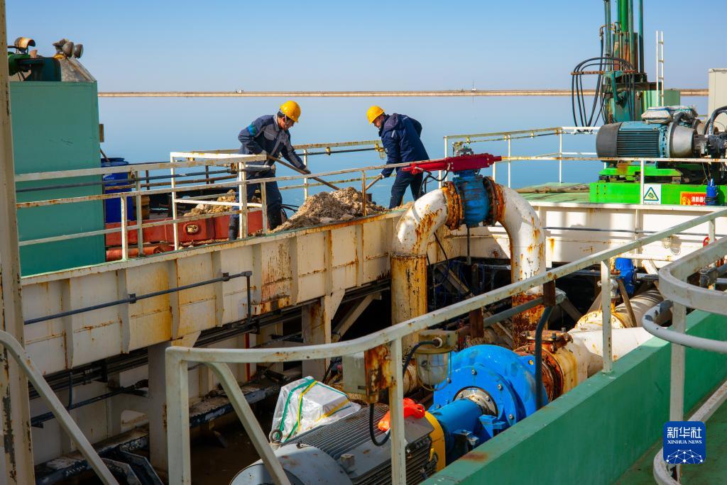 2月2日,贺连福(右)与同事将水采船上清理出的盐块转移到工作船上清运走。