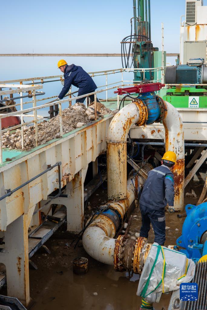2月2日,贺连福(上)与同事将水采船上清理出的盐块转移到工作船上清运走。