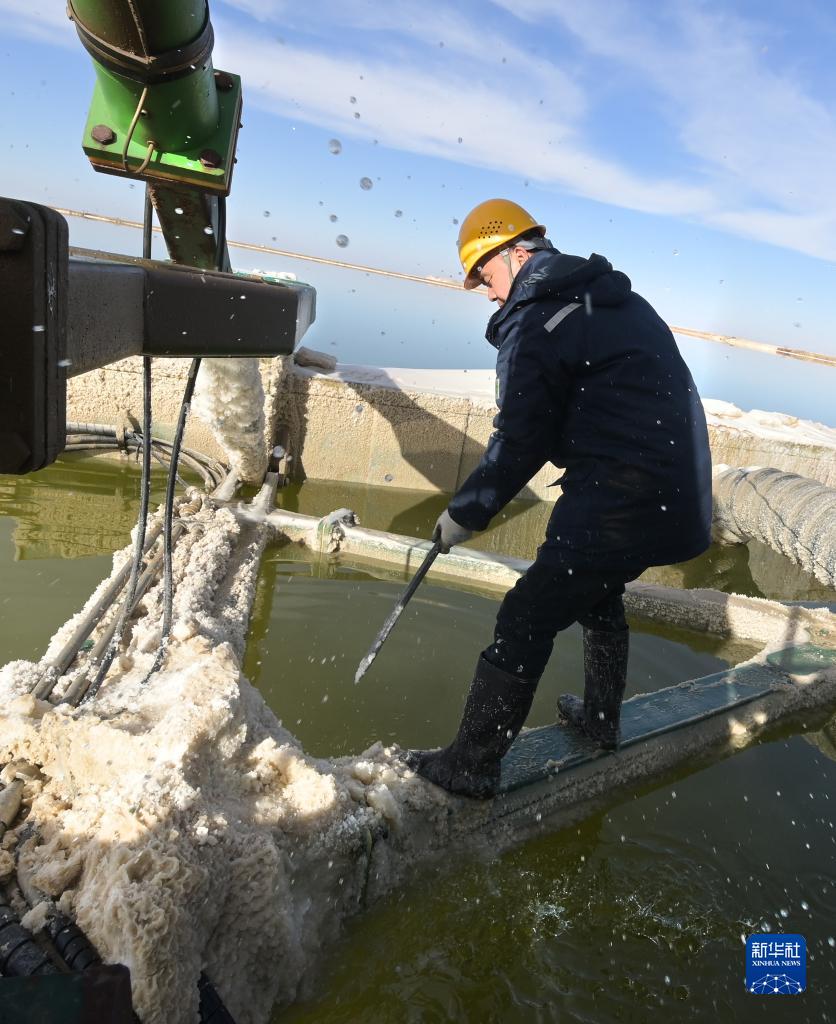 2月2日,贺连福使用工具铲除附着在船体上的卤水结晶。