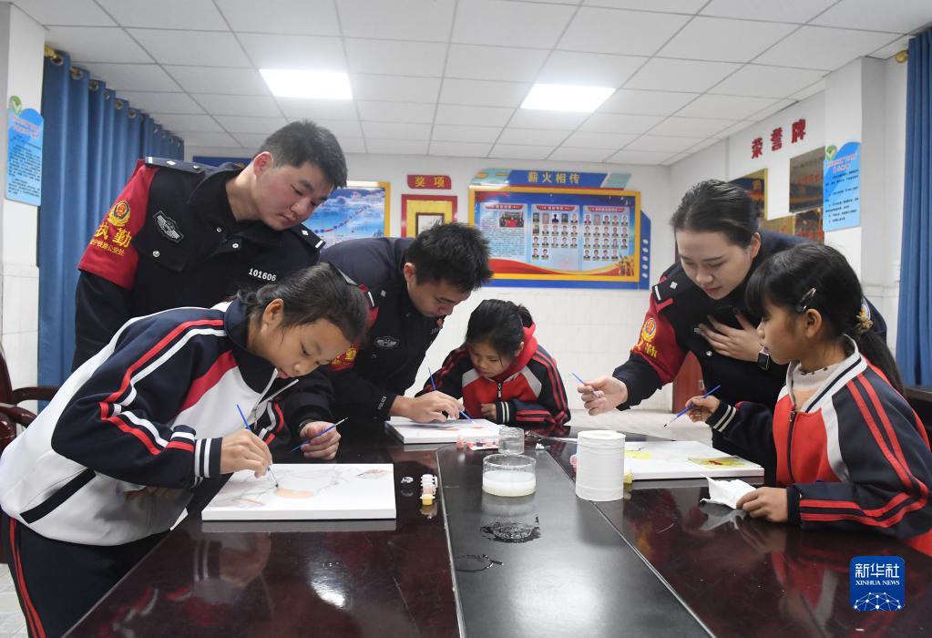 2月5日,在南宁铁路公安局南宁公安处宾阳站派出所,民警与三姐妹一起画画。家住宾阳县和吉镇三叉村的吕秀清、吕秀萍和吕秀玲三姐妹,是当地的留守儿童,派出所青年民警志愿者常常利用业余时间辅导她们学习,疏导心理,至今已经4年。