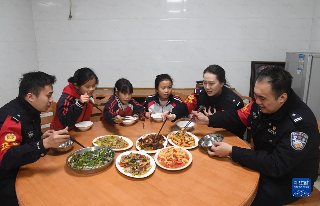 2月5日,南宁铁路公安局南宁公安处宾阳站派出所民警与三姐妹一起吃午饭。家住宾阳县和吉镇三叉村的吕秀清、吕秀萍和吕秀玲三姐妹,是当地的留守儿童,派出所青年民警志愿者常常利用业余时间辅导她们学习,疏导心理,至今已经4年。