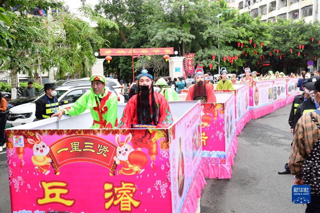 2月5日,游客在海口市琼山区府城观看“装马匹”巡游活动。