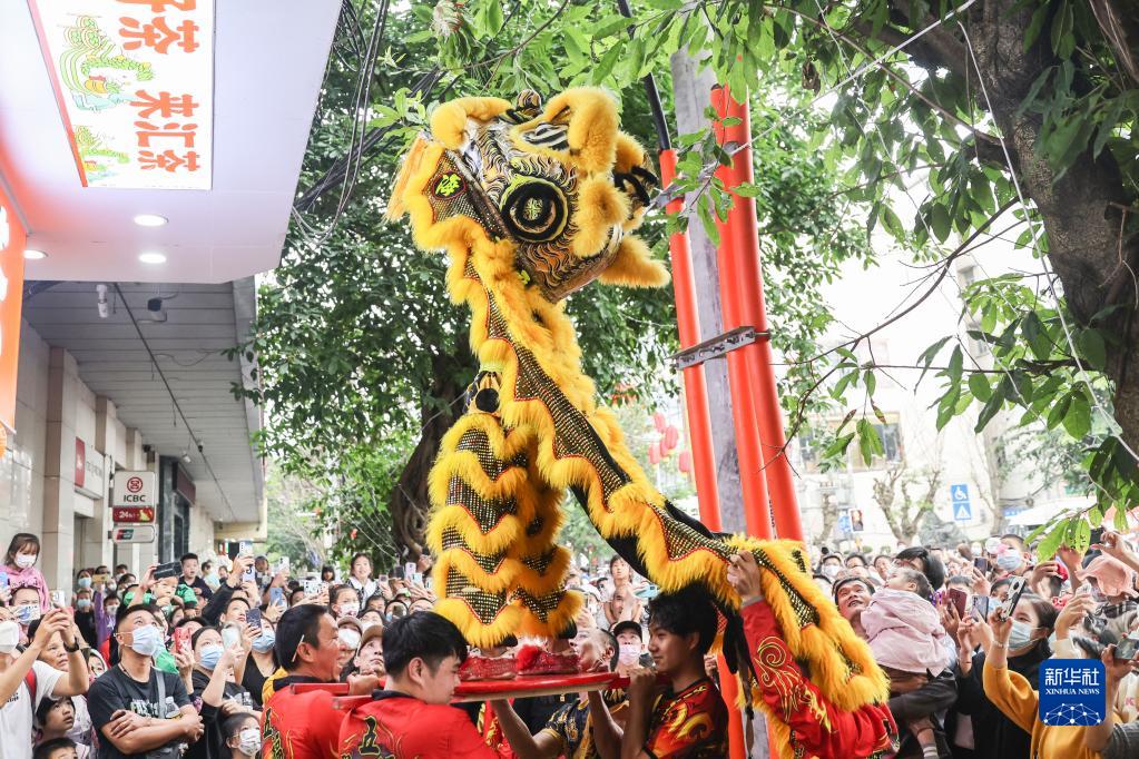 2月5日,游客在海口市琼山区府城观看舞狮表演。