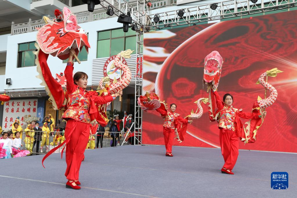 2月5日,在云南省腾冲市北海镇,女子小背龙舞龙队在元宵节文艺演出中表演。