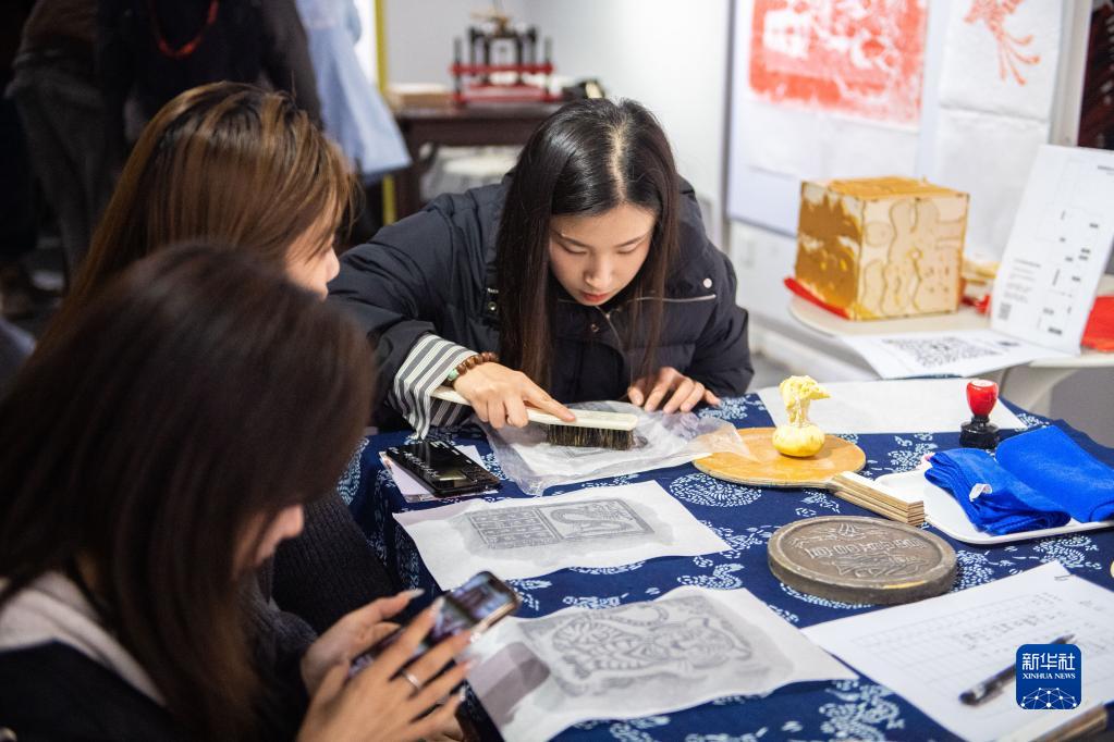 2月5日,在湖南省长沙市天心区太平老街前行美术馆,市民在体验拓印。
