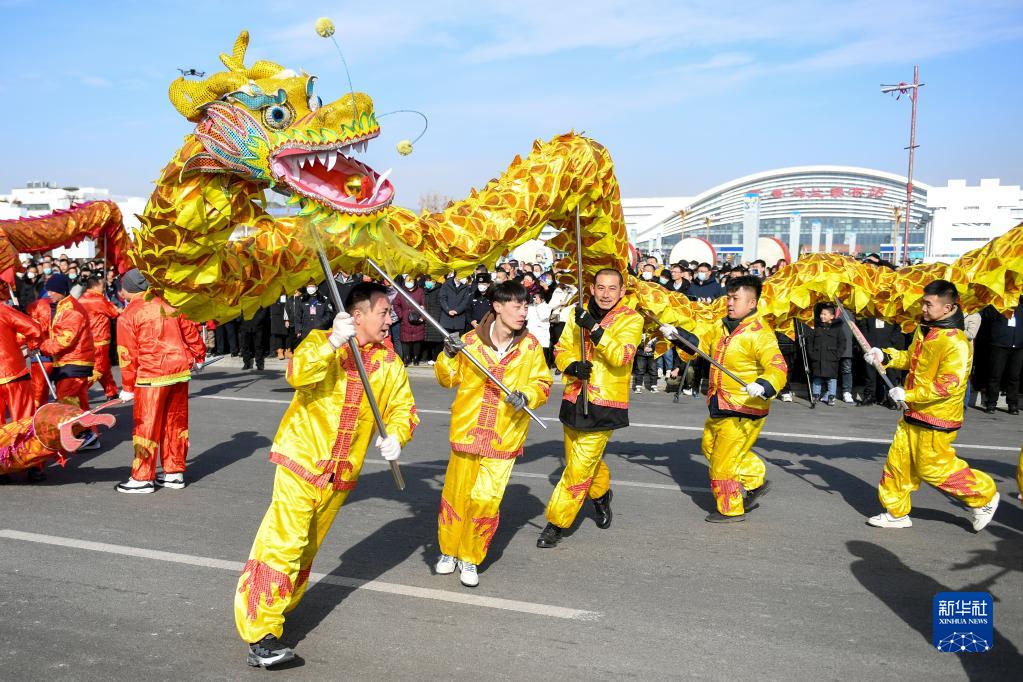 2月5日,人们在内蒙古乌兰察布市乌兰察布站前广场表演舞龙。