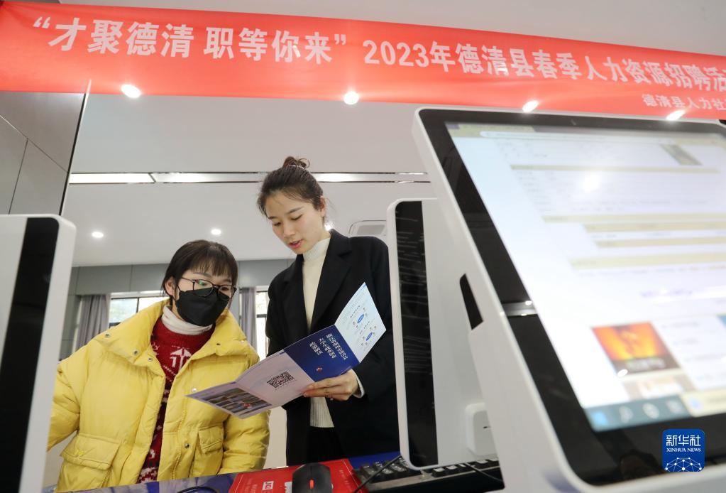 2月6日,在浙江省湖州市德清县下渚湖街道举办的新春招聘会大学生专场,应聘人员(左)在咨询。