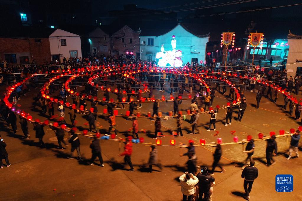 2月5日晚,浙江省东阳市南马镇防军村的村民们在迎龙灯闹元宵(无人机照片)。