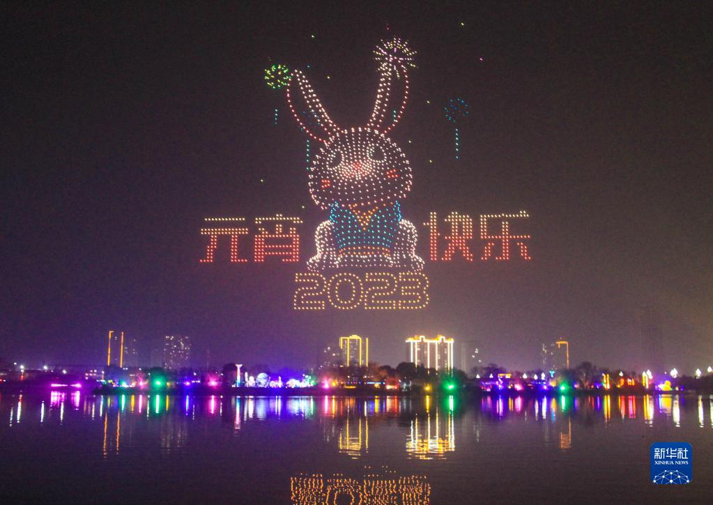 2月5日,河南省南阳市中心城区,游客在观看无人机编队在夜空中组成的造型。