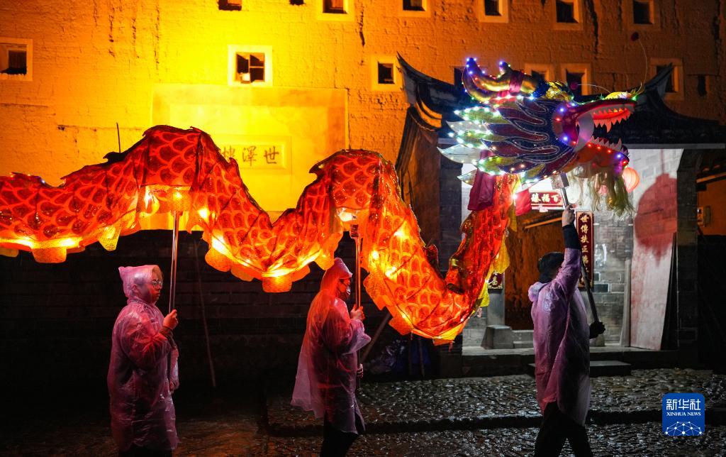 2月5日,在福建省龙岩市永定区高头镇高北村,村民在村庄内游龙,途经土楼“世泽楼”。