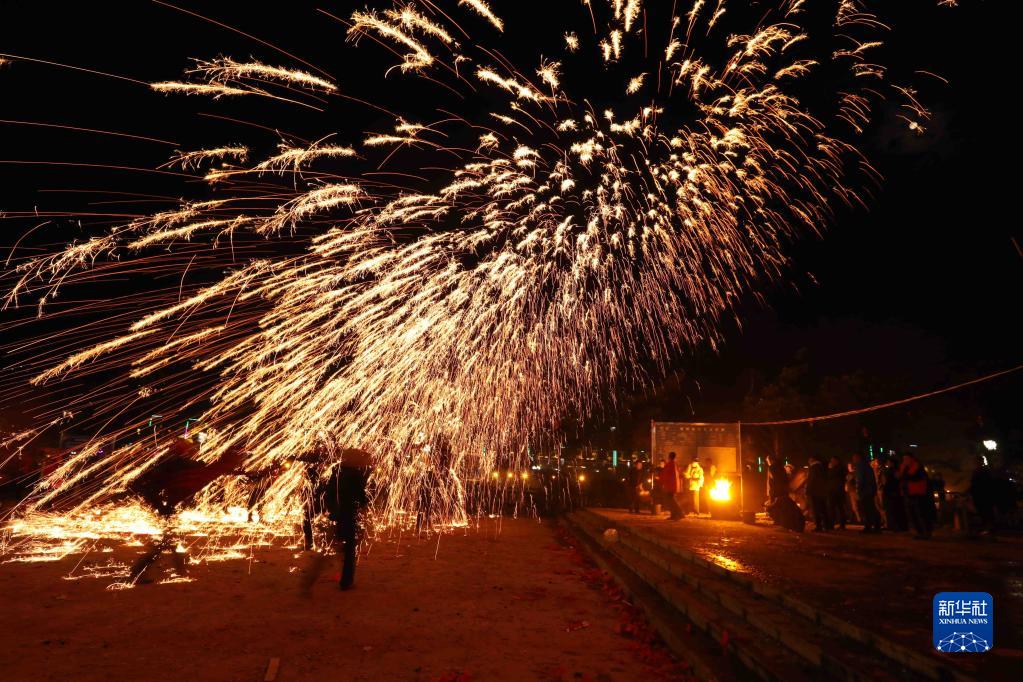 2月5日,民间艺人在贵州省赤水市官渡镇小广场表演“打铁花”。
