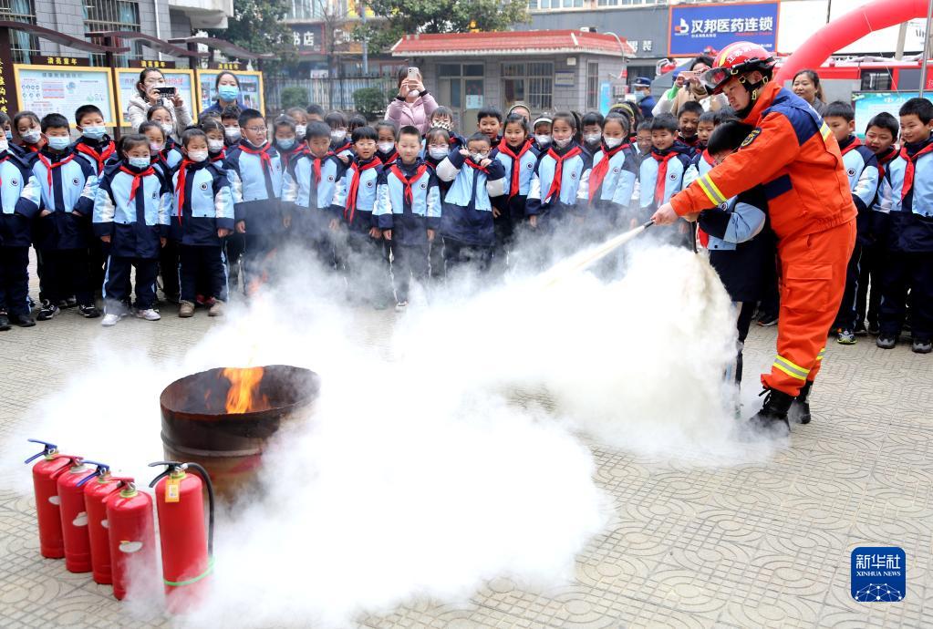 2月6日,在江苏省连云港市墟沟小学,消防救援人员教学生正确使用消防灭火器。