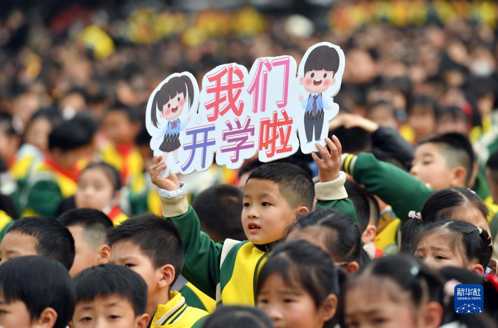 2月6日,四川省南充市蓬安县实验小学的学生举着“我们开学啦”的牌子参加开学典礼。