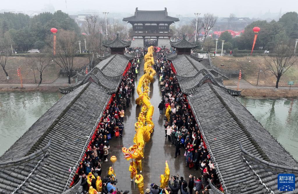 当日,安徽省全椒县传统民俗活动正月十六“走太平”拉开帷幕,巡游队伍穿过太平桥,献上精彩纷呈的民俗表演。